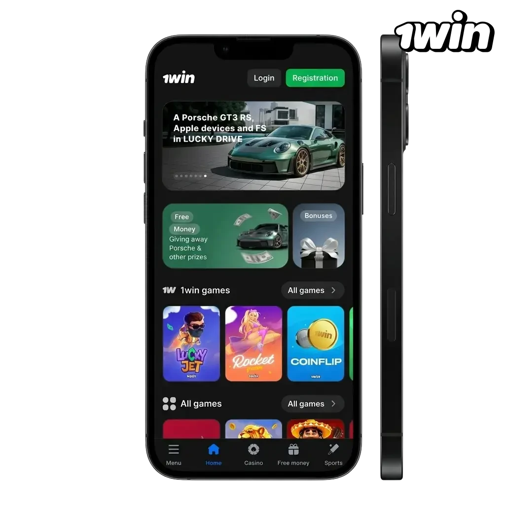 The 1win app features a clean, dark-themed layout with a bottom navigation bar that keeps all major sections within one tap. The interface is designed for fast access, with sports markets, casino categories, and account tools displayed clearly across all screen sizes.
